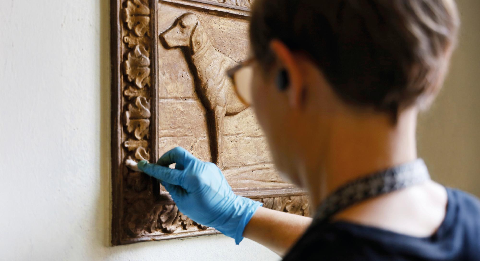 Emil Cedercreutzin reliefejä kunnostetaan viimeisimmän peruskorjauksen jälkeen.